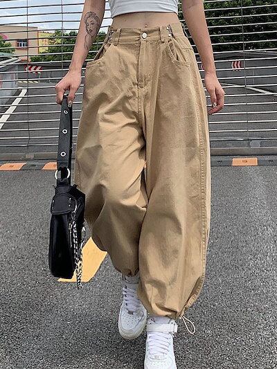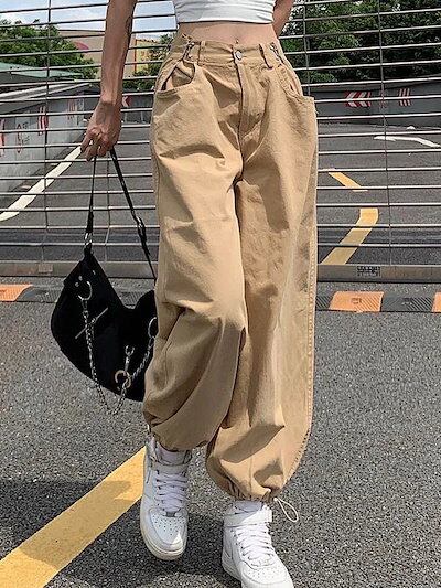 春秋 ハイウェスト 着痩せ ブラック カジュアルパンツ レディース ゆったり ストレー ト ハーレムパンツ カーゴパンツ
