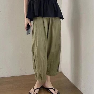 レディースセミワイドタック入りカジュアルゆったりワイドパンツンパンツアンクルパンツ9分丈ガウチョパンツサルエルパンツ綿麻パンツ綿麻ゴムウエスト薄大きいサイズ紺ネイビーバルーンシルエット