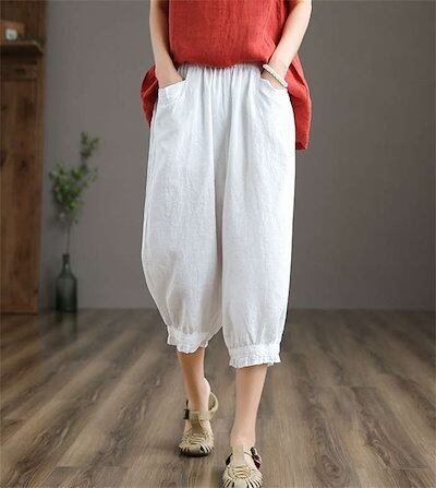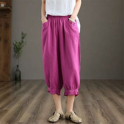 テーパードパンツ パンツ レディース サルエルパンツ 7分丈 春 夏 無地 クロップドパンツ ウエストゴム ギャザー タック リネン 麻 綿麻 リネンパンツ コットン シンプル ワイドパンツ ボトム