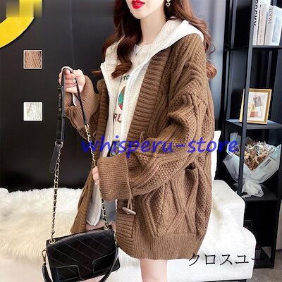 ニットパーカー レイヤード風 フード付き ケーブル編み ニットカーディガン レディース アウター