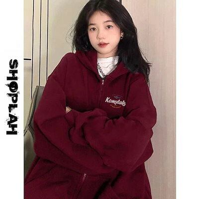 人气新作韓国 パーカー 着痩せ 長袖tシャツレディース Tシャツパーカーレトロなワインレッドの文字がプリントされたセーター 新しい秋と冬のジップカーディガンジャケットインス30%制限