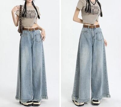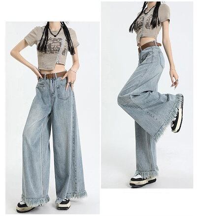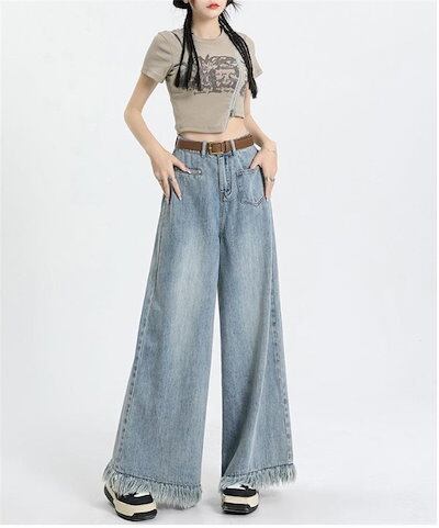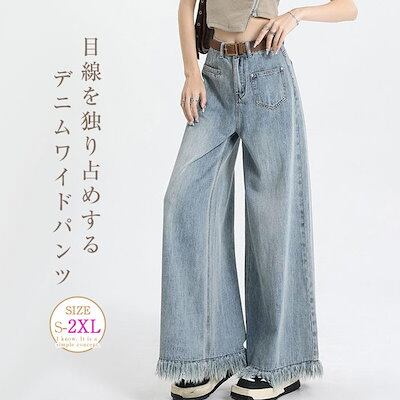デニムワイドパンツ タッセル レディース デニムパンツ ジーパン バギーパンツ ボトムス デニムパンツ 長ズボン ジーンズ 大人カジュアル ハイウエスト 大きいサイズ ゆったり 体型カバー 柔らかなデ