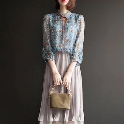 7分袖襟リボンかわいいシフォンレディーストップス春夏ブラウス袖フリルシースルーブラウスポリエステルシフォン風カジュアルフラワープリント