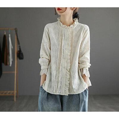 ブラウス 立ち襟 フリル シャツブラウス レディース コットン シャツ 長袖 綿ガーゼ 麻 ナチュラル風 刺 レース 通勤 カジュアル きれいめ ゆったり