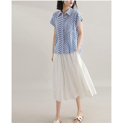 シャツ 半袖 レディース 夏 ブラウス フレンチスリーブ オフィス ストライプ柄 シャツ 折り襟 薄手 vネック トップス プルオーバー 大人 ビジネス 通勤