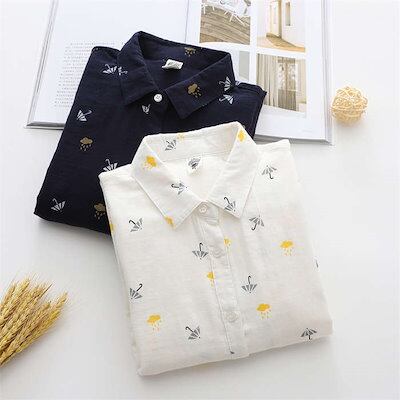 シャツブラウスレディース長袖春秋ダブルガーゼトップス長袖シャツ折り襟きれいめ総柄コットン綿100%シンプルコーデゆったりカジュアル可愛い綿シャツガーゼ長袖秋プリントガーゼシャツコットンシャツブラウス綿