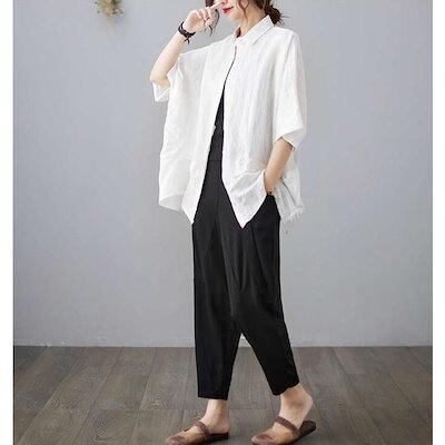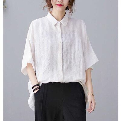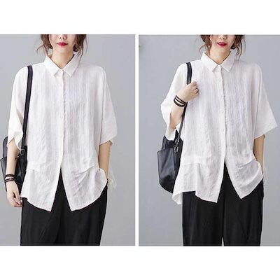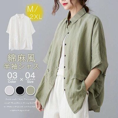 シャツ ブラウス レディース 半袖 ドルマンスリーブ ゆったりシャツ 綿麻シャツ トップス チュニック 前開き ボタン留め 折り襟 無地