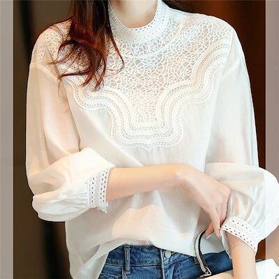 春秋レディースシャツブラウス長袖トップス白レースパフスリー立ち襟フォーマル体型カバー通勤オフィス無地ゆったりデイリー
