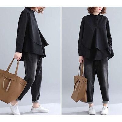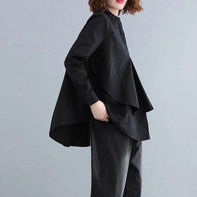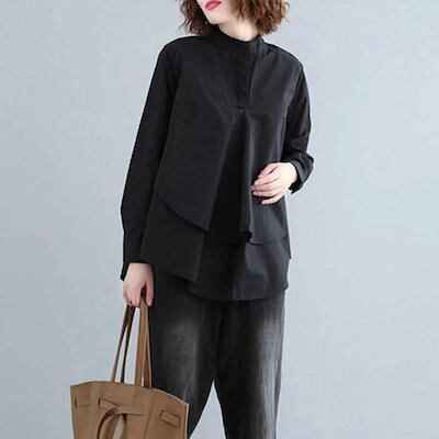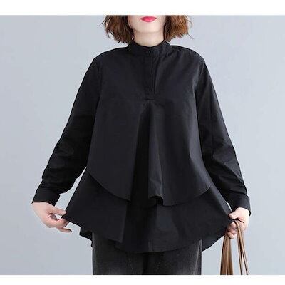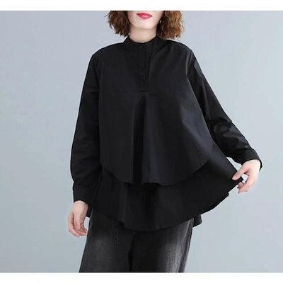 シャツ レディース ブラウス 黒 長袖 立ち襟 フレア 春 秋 長袖 オフィス 通勤 シャツブラウス 無地 Aライン トップス レイヤード風