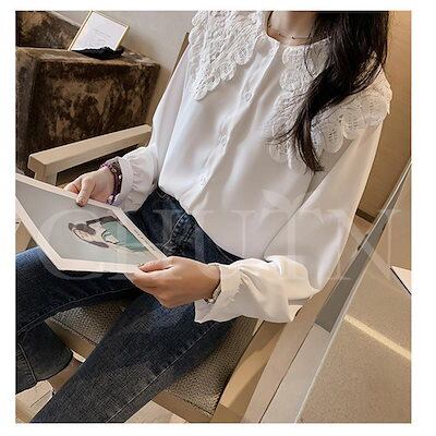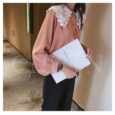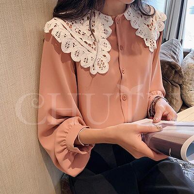 万能流行感 シャツ ブラウス レディース ピーターパン襟シャツ 長袖 レース切り替えブラウス バルーン袖 トップス 春秋 シフォンブラウス お洒落 韓国風 ゆったり カワイイ