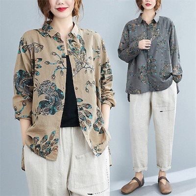 シャツ トップス ロングシャツ ブラウス レディース 折り襟 綿麻 長袖 花柄 体型カバー ゆったり 夏から秋 旬のスタイル アイテム