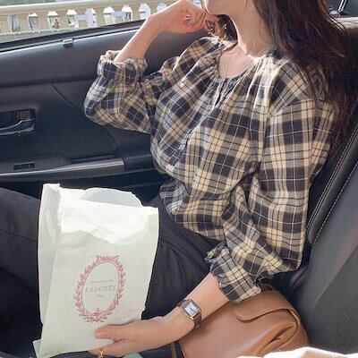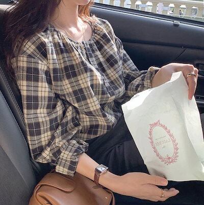 シャツブラウス チェック柄ブラウス ラウンド襟 チェック柄 ゆったり ボタン レディース トップス