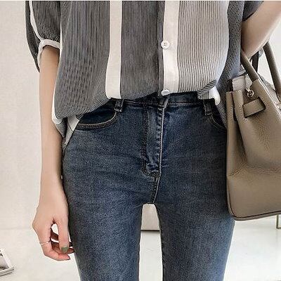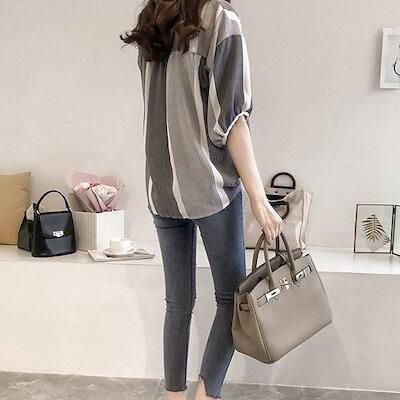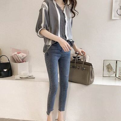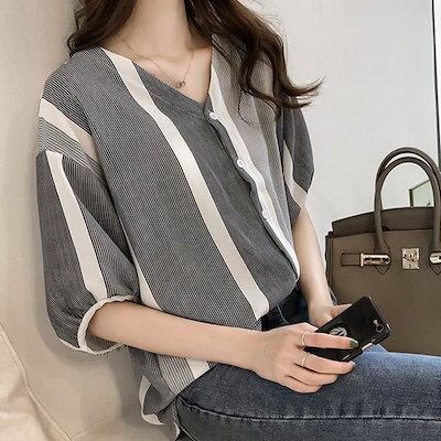レディースファッショントップスデートシャツブラウスカットソー袖あり7分袖七分袖Vネックロングテールスリット襟なしスリム細身前開き柄ストライプモードXL2XL3XL4XL大きいサイズ102030
