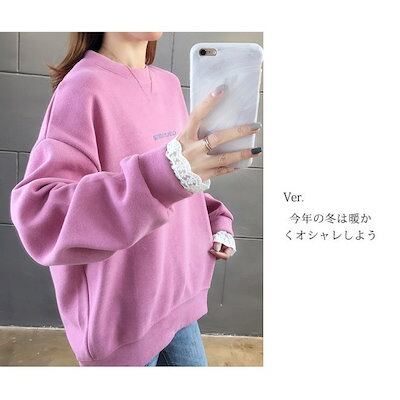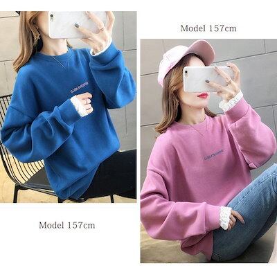 トレーナー 裏起毛 袖口レース ロゴ おしゃれ レディース 秋冬 トップス カットソー 厚手 プルオ