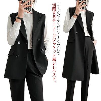 ジレ ロング トップス 秋冬 テーラード レディース 30代 ベスト ダブル テーラードベスト スーツ生地 裏地付き シンプル ロングベスト 前開き 羽織り フォーマル セレモニー 無地 春 キレイめ