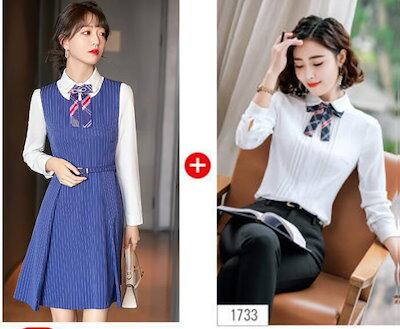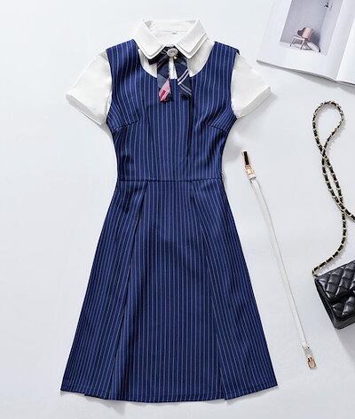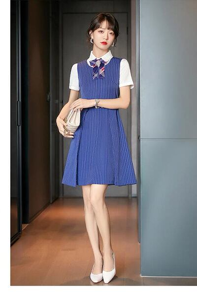 フォーマルワンピース ワンピーススーツ 長袖/半袖ワイシャツ 春夏秋服 レディース ストライプ柄ワンピース 通勤 オフィス 団体服 ベルトあり エレガント ネイビー S〜5XL