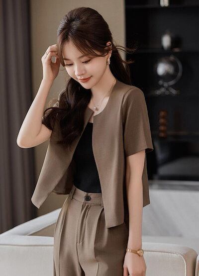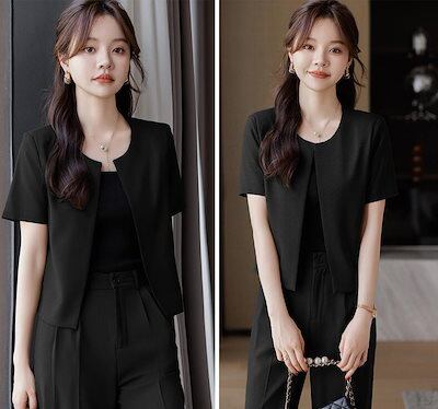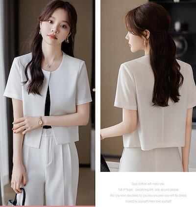 夏レディーススーツセット ノーカラースーツジャケット パンツセット 無地 20代 30代 40代 半袖 フェミニン 事務服 フォーマル 制服OL ビジネス 入学式 卒業式 通勤 スーツジャケット オフ