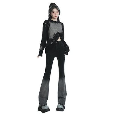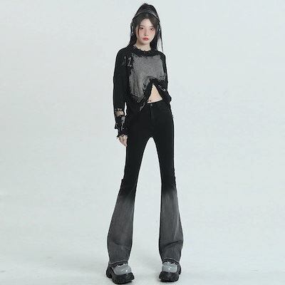 2024 初秋 デニムパンツ グラデーションクラッシュカラーマイクロフレアージーンズ女性用ブラックニッチハイウエストデニムパンツストレートスリムストレッチドラッグフレアホースシューパンツ 韓国ファッシ