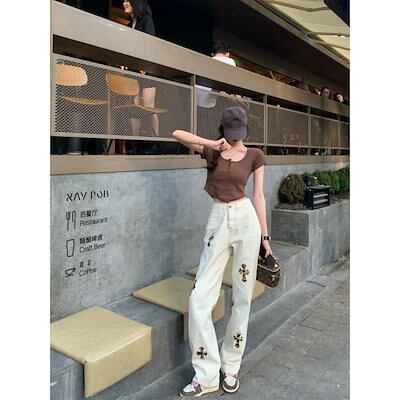 2024 初秋 デニムパンツ ジーンズ パンツ ハイウエスト ストリート ハンサム女子 ゆるダボ 美脚 体型カバー ホワイトコーデ スタイルアップ 色っぽ 女っぽ カジュアル きれいめ 大人っぽ 韓国
