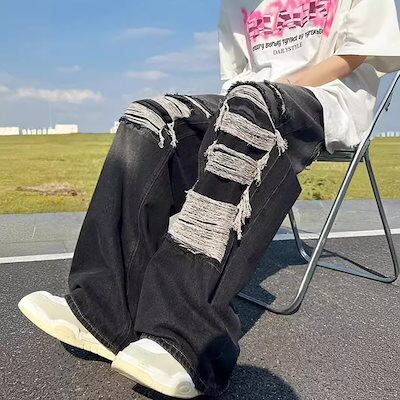 2024 初秋 デニムパンツ 男女兼用 カップル ボトムス ジーンズ バックウエストゴム ゆったり ゆるダボ ジーンズ シルエット加工 カジュアル メンズライク 韓国ファッション