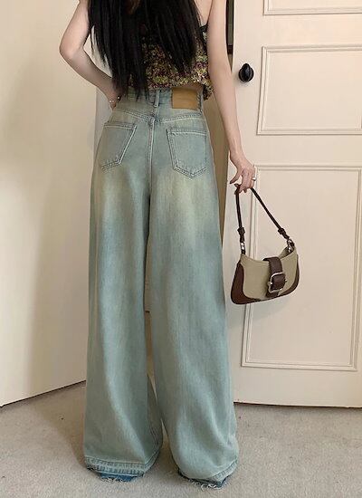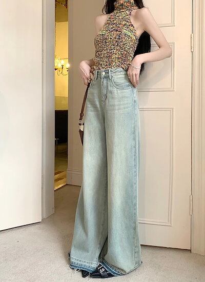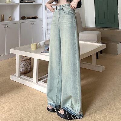 ボトムス レディース ハイウエスト ウォッシュ加工 ワイドデニム ジーンズ ワイドパンツ バギーパンツ スタイルアップ 脚長 美脚 カジュアル かっこいい クール 韓国