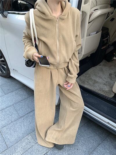 2024 秋冬 韓国 かわいい レディース 無地 フード付き長袖アウターレトロセット黑白フーディーブルサイズ丈トップス春カジュアルスポーツファッション系通学学生袖お出かけアップシルエットトラック