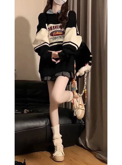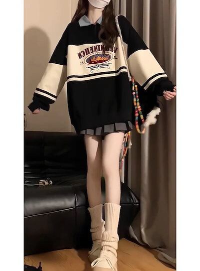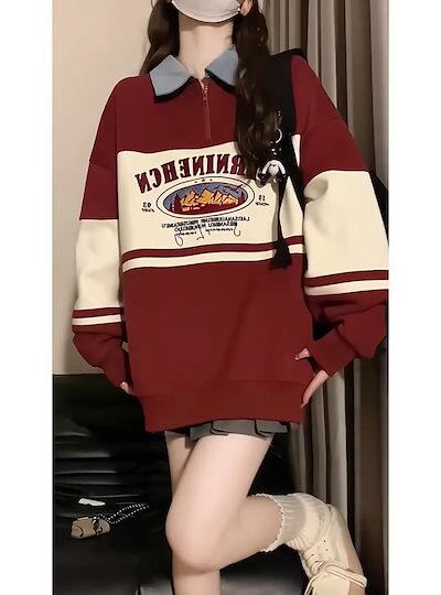 2024 秋冬 2TYPE 裹起毛トップス長袖 かわいいプリントK-POPTロングレディース韓国風衣装カラールーズゆったりカジュアルハーフおしゃれサイズスリーブシルエットファッション系サイドシャツ