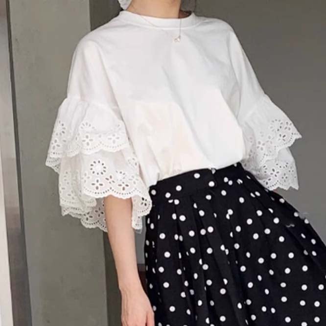 【2024夏新作】韓国風レディース服 半袖Tシャツ ブラウス レーススリーブ トップス おしゃれ 綺麗め