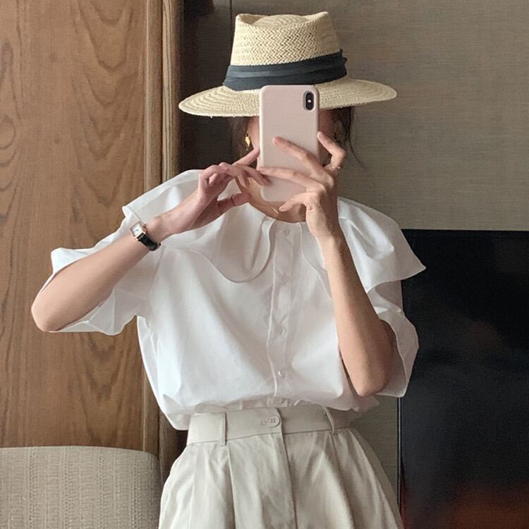 トップス シャツ ブラウス 半袖 ビッグカラー デザインシャツ レディース