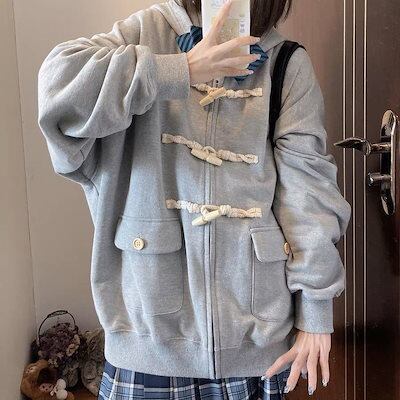 マウンテンパーカー 韓国ファッション 秋冬のゆるいフードパーカーレディース牛角ボタン100枚羽織日系キャップカーディガン野球着長袖