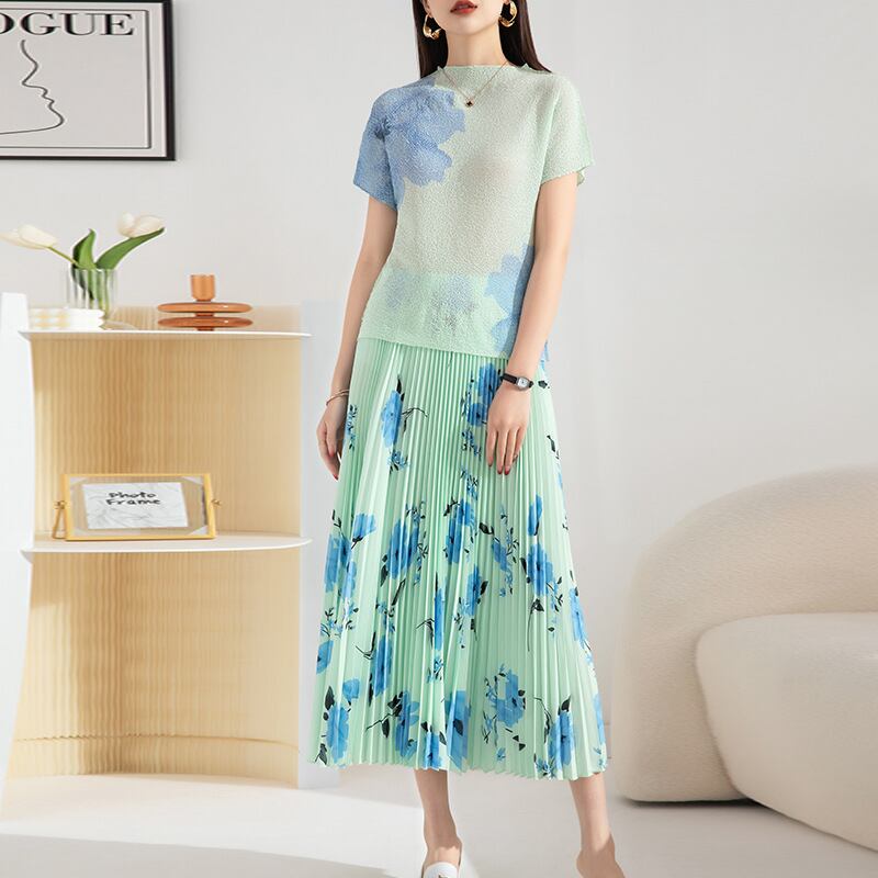 初回送料無料 新作プリーツファッション半袖プリントトップスとスカート2点セット ファション商品