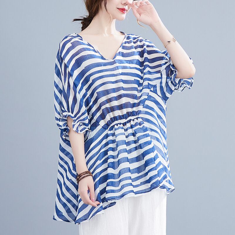 初回送料無料サマー半袖ゆったりシャツストライプトップスレディースブラウスファッション