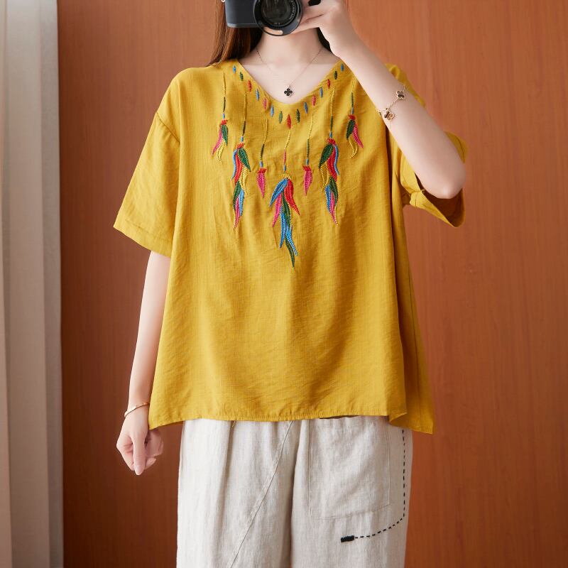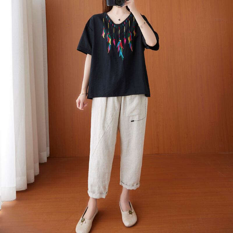 初回送料無料刺?レディースファショントップスブラウス半袖ラージサイズコットンリネンTシャツ