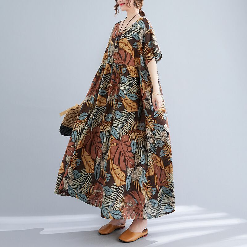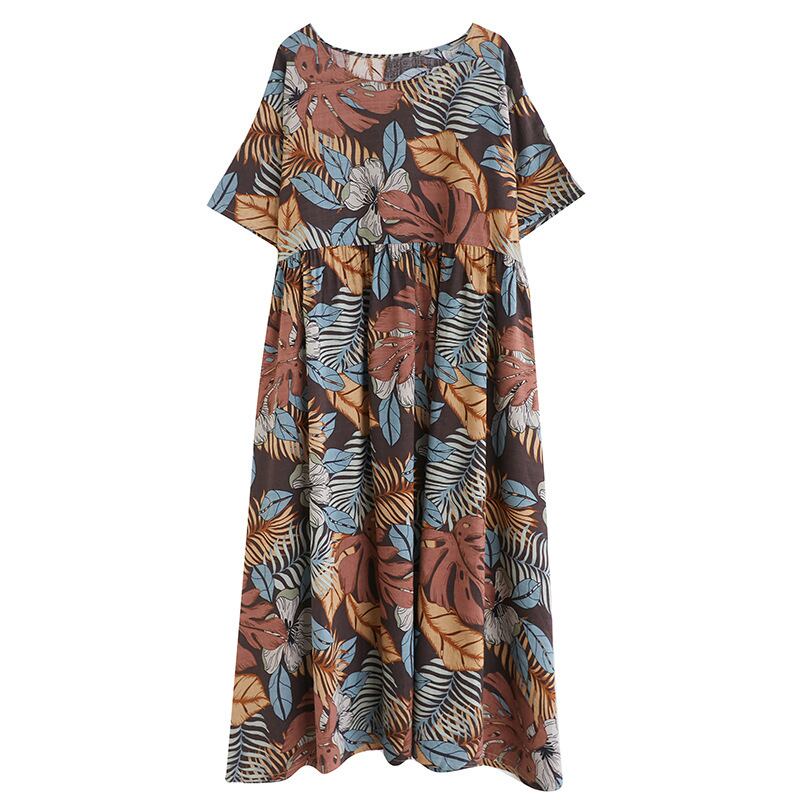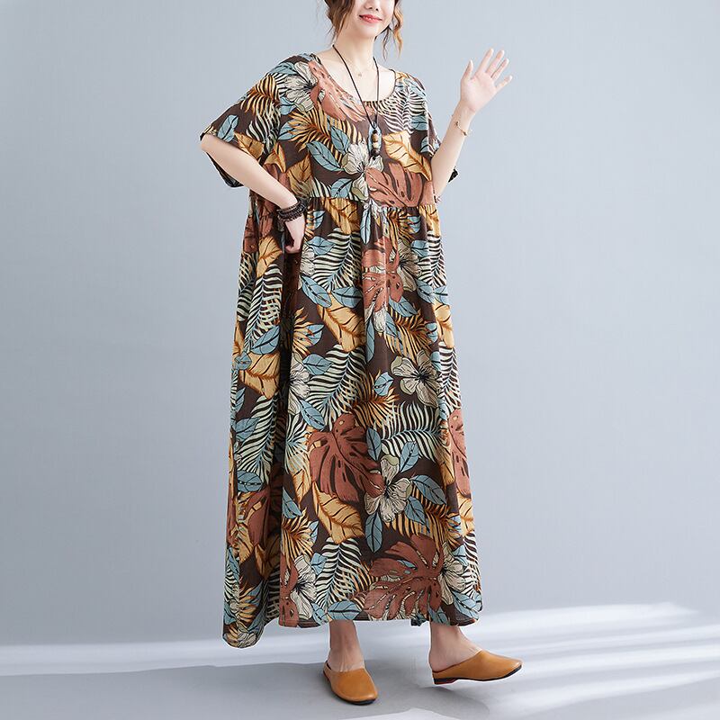 初回送料無料新作トップスワンピース綿リネンのプリントドレス半袖ワンピース