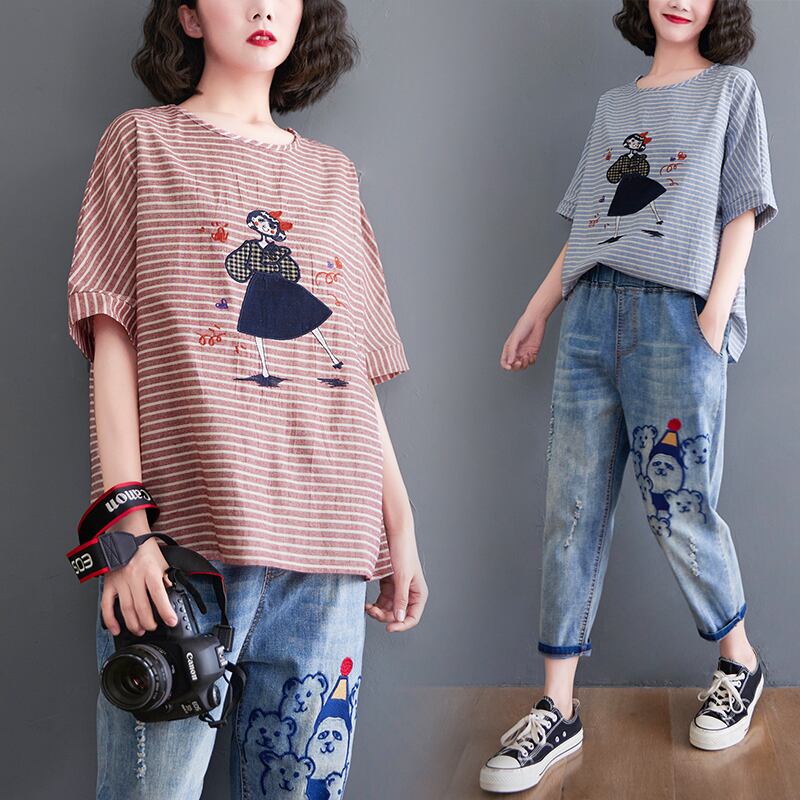 初回送料無料夏新作レディーストップス コットンリネンゆったり半袖ラウンドネック薄い刺?Tシャツ