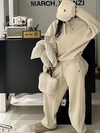 春秋 セットアップ 運動 スウェット ワイドパンツ ストレート ラウンドネック 厚手 裏起毛 パンツ スカート 大きいサイズ ゆったり カジュアル ポケットデザイン レディース 長袖スウェット