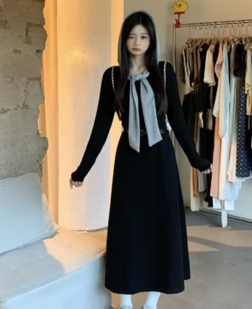 2024春秋新作 女 レディースハイウエスト 長袖 帽子付け ロング ワンピース 台型スカート