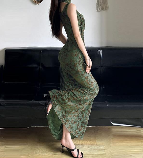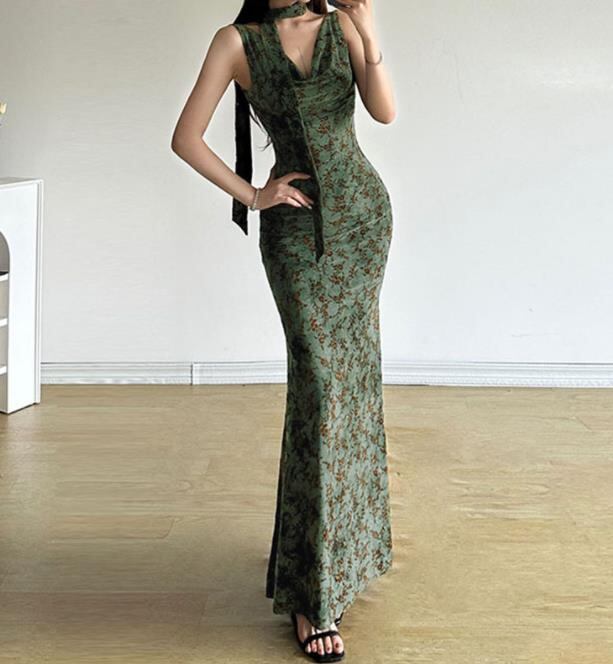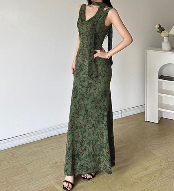 2024春秋新作 女 レディース 袖なし 花柄 吊りスカート ロング ワンピース マーメイドスカート