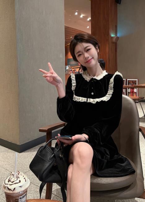 2024春秋新作 女 レディース ハイウエスト 長袖 ベロア ミニ ワンピース ドレス 台型スカート