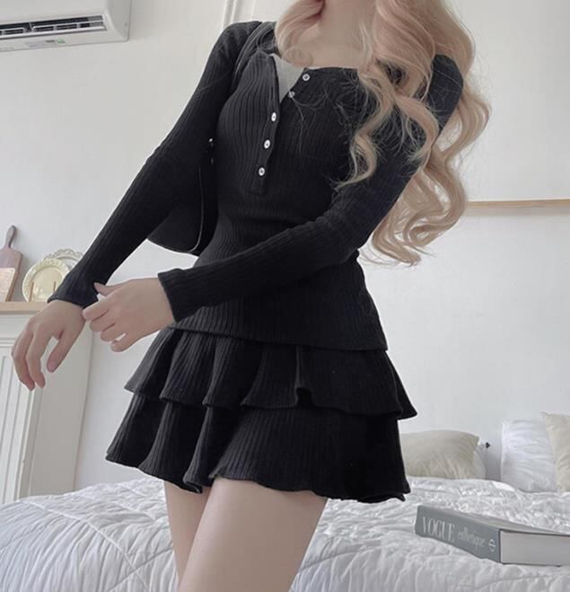 2024春秋新作 女 レディース ハイウエスト 長袖 ニット ミニ ワンピース ドレス 台型スカート