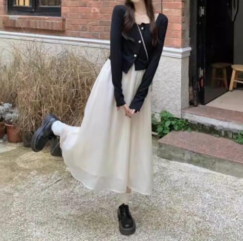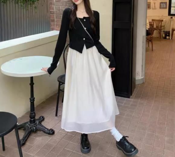 2024春秋新作 女 レディース 長袖 ハイウエスト ロング ワンピース 台型スカート