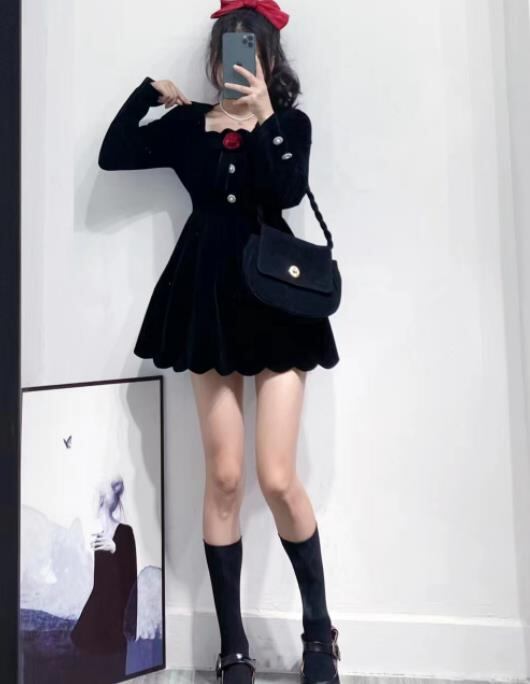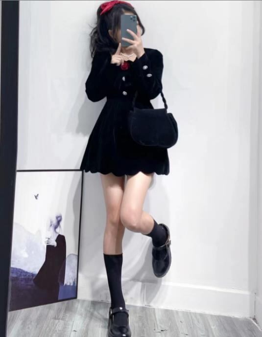 2024秋冬新作 女 レディース ハイウエスト 長袖 ベロア ミニ ワンピース ドレス 台型スカート