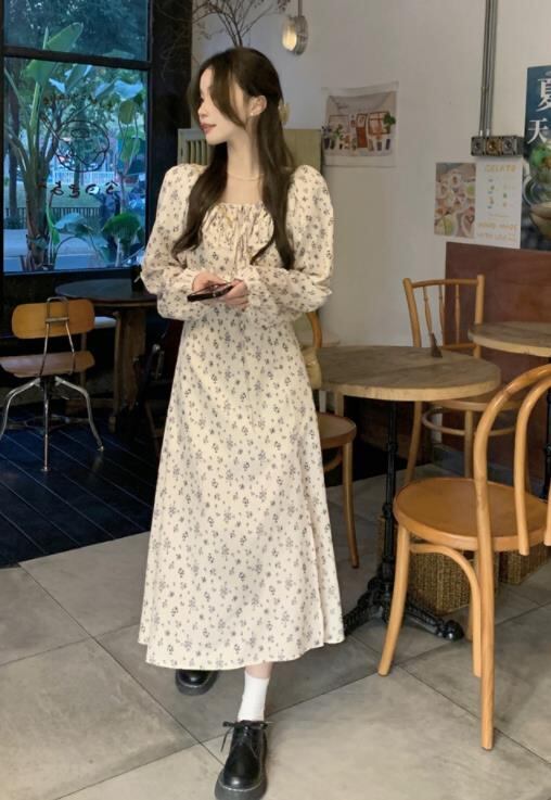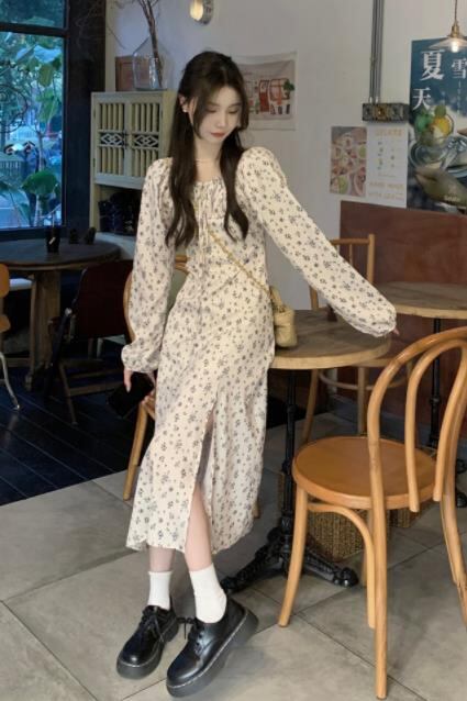 2024春秋新作 女 レディース 長袖 ハイウエスト 花柄 ロング ワンピース 台型スカート