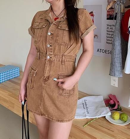 2024春夏新作 女 レディース ハイウエスト 半袖 デニム ミニ ワンピース ドレス 台型スカート