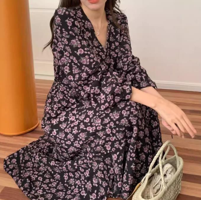 2024春秋新作 女 レディース ハイウエスト 長袖 Vネック ロング ワンピース 台型スカート