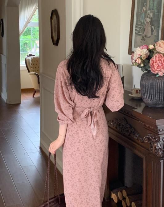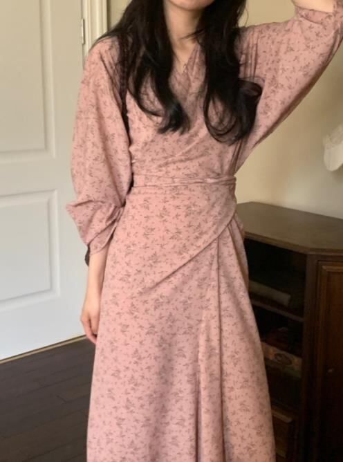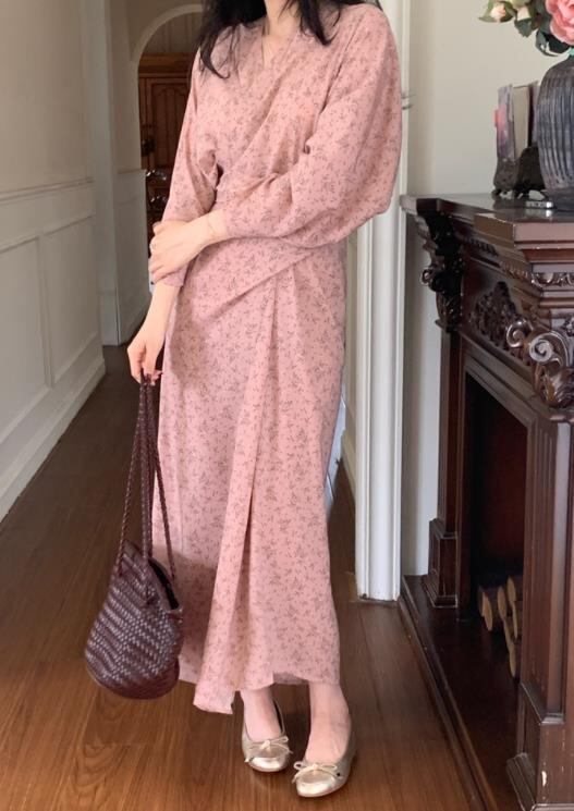 2024春秋新作 女 レディース ハイウエスト Vネック 長袖 花柄 ロング ワンピース 台型スカート