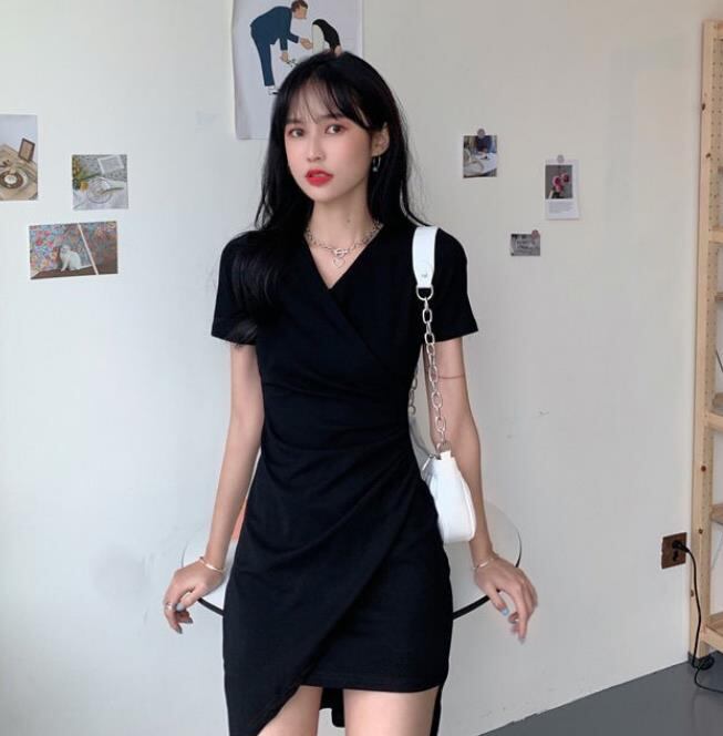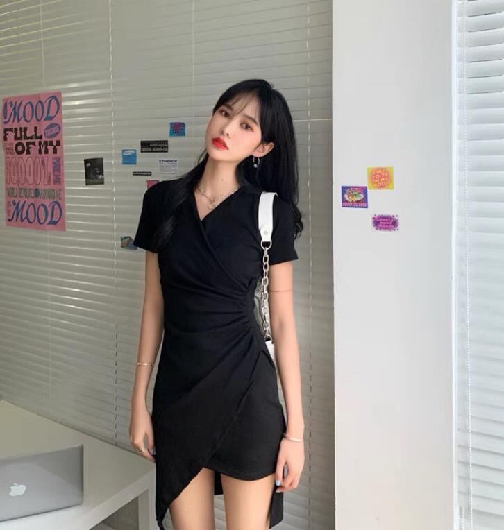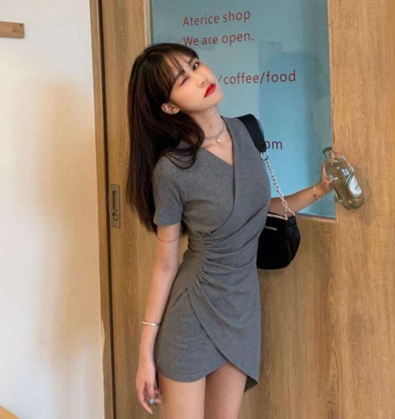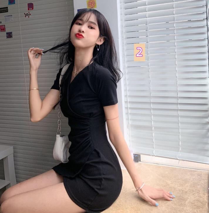 春夏新作 女 レディース ハイウエスト 半袖 無地 ミニ ワンピース ドレス タイトスカート 2色 S-2XL