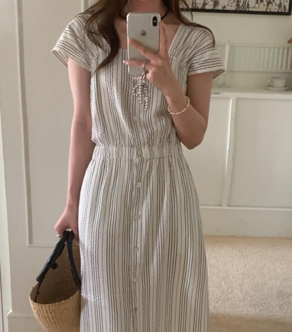 2024春夏新作 女 レディース ハイウエスト 半袖 ボーダー柄 ロング ワンピース 台型スカート