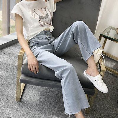 ハイウエスト デニム ワイドパンツ 切りっぱなし デニム パンツ 春夏 薄手 デニム ストレート ジーパン レディース