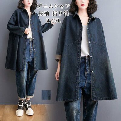 デニムシャツ レディース 長袖 デニム チュニック 折り襟 前開き ボタン ロングシャツ ポケット付き 羽織り トップス ゆったり 体型カバー 長袖シャツ ブルー レトロ 無地 シンプル カジュアル
